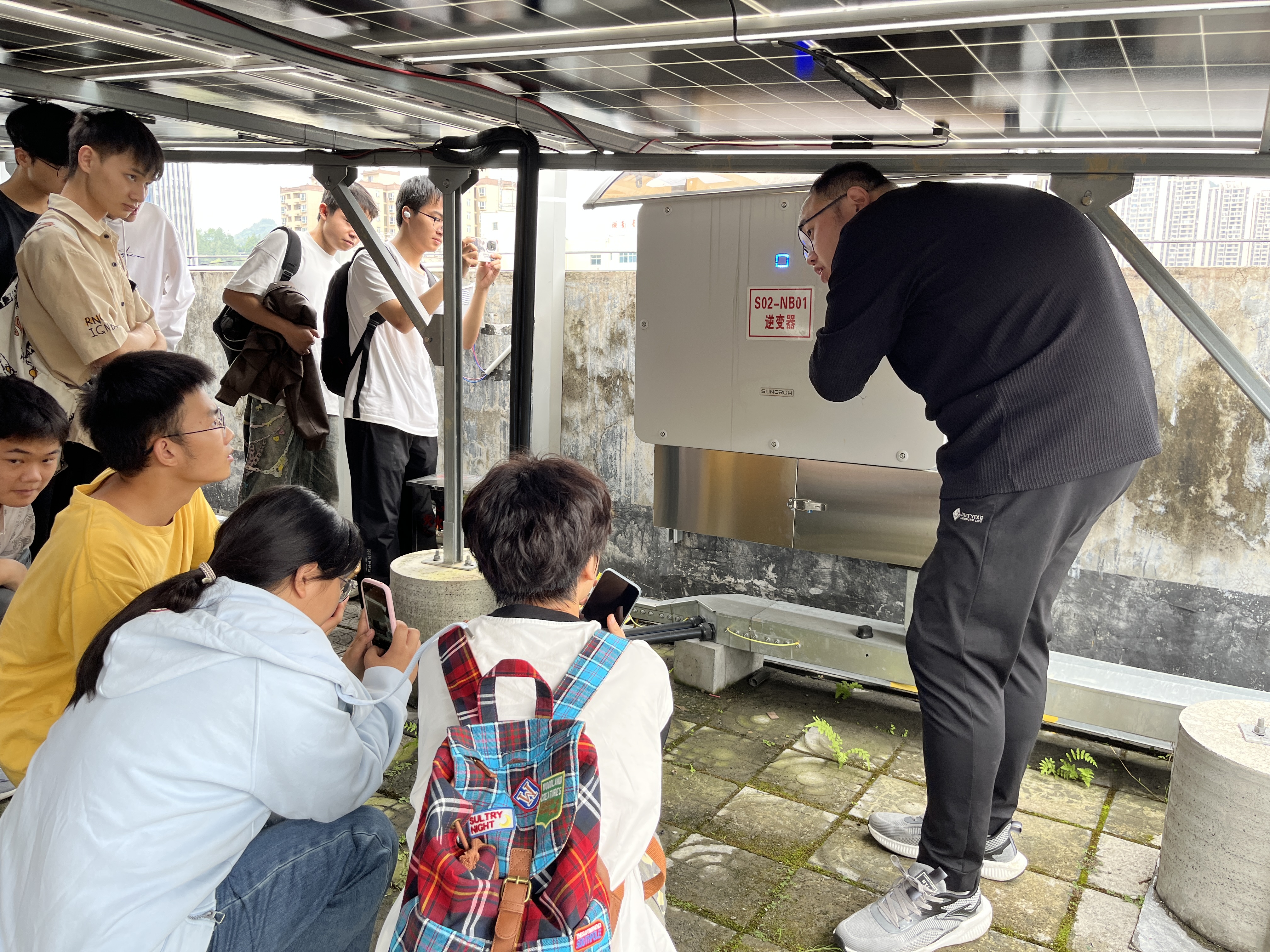 随后,同学们走进电站的逆变器处。在逆变器旁,牛一博老师详细解析了逆变器的工作流程,从光伏板产生的直流电如何转化为可并网的交流电,到设备的日常巡检重点、常见故障排查方法,均进行了细致讲解。