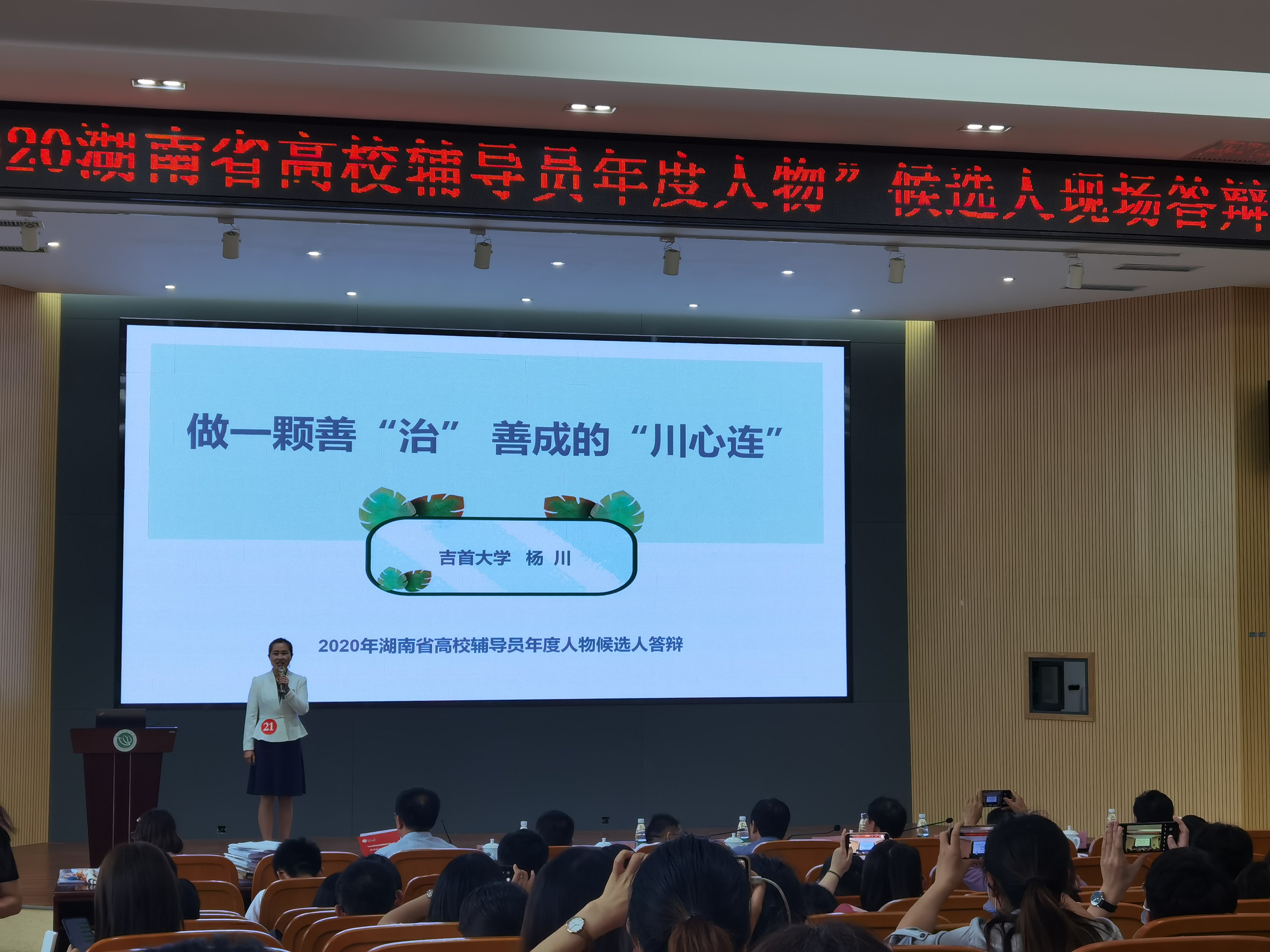 球友会杨川老师以“做一颗善‘治’善成的‘川心莲’”主题给大家展示了异常精彩的答辩。她坚定的政治信念、优良的师德师风、过硬的素质能力、突出的育人成效及精彩的答辩表现,得到了评委们的高度评价,最终以总分第一的成绩获评“2020湖南省高校辅导员年度人物”荣誉称号。
