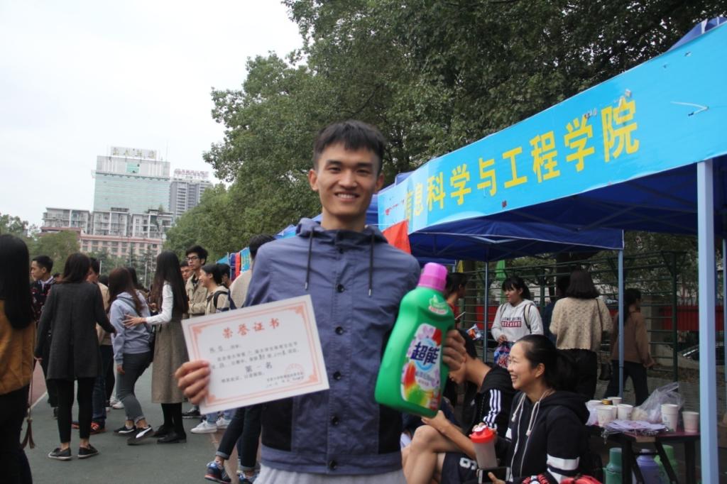陈哲,现为信息科学与工程学院15级电子班的班长。这个来自株洲的小伙子,在去年刚进校,就在球友会第一届体育文化节上,以博得100米、200米两项短跑冠军而一炮走红。在第二届体育文化节上,100米与200米短跑项目的冠军仍然被他拿下。于是,有人调侃:哲男神,你可是收了一麻袋洗衣液了!