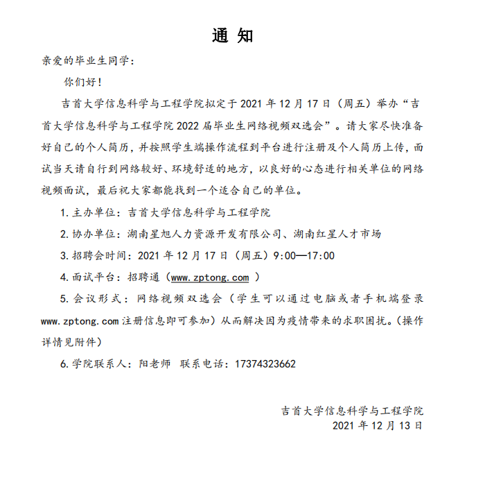 当前位置: 首页» 招生就业» 就业信息 球友会信息科学与工程学院2022届毕业生网络视频双选会通知 时间:2021-12-08 点击: 作者: 详细内容见附件! 请点击下载附件:2022届毕业生网络视频双选会通知(学生版).pdf 上一条:中国商飞公司2022校园招聘公告 下一条:北京掌上先机网络科技有限公司2022秋季 招 聘 【关闭】