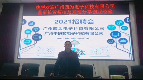 讲座伊始,黄生祥对2003级电子信息工程专业校友黄智,现广州四为电子科技有限公司董事长进行了简单的介绍,对优秀校友返校讲座及招聘毕业生致以热烈的欢迎,希望同学们能够认真聆听,有所收获。